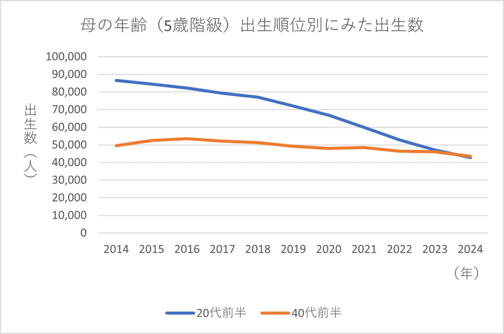 2024年の出生数は、20代前半が42,754人だったのに対し、40代前半が43,463人となり、出生数が逆転する現象が起きました。